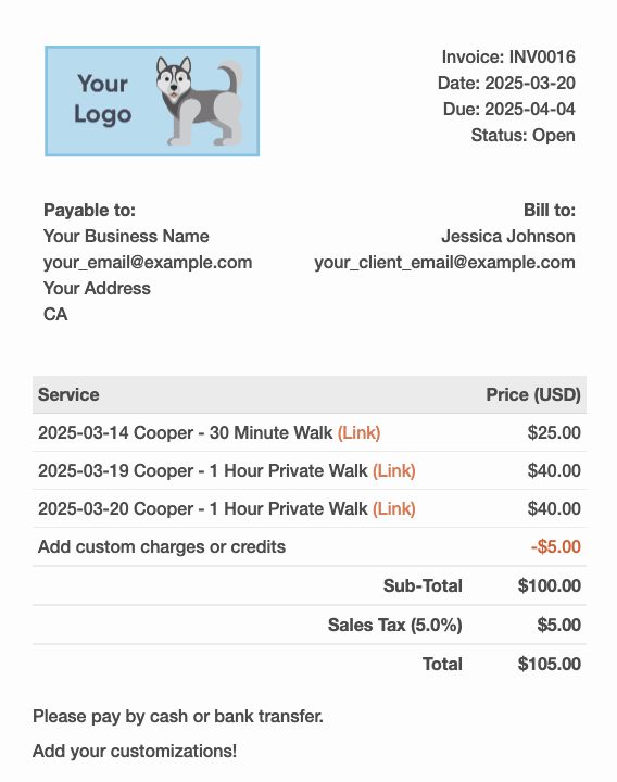 Doggy Logs Invoices provide an organized and professional way to bill your clients. Easily create invoices that reference walks or other services. They are customizable to include non-Doggy Logs items, such as one-off fees or products you sell. Clients receive simple and elegant PDF’s by email, all branded with your logo and business information.