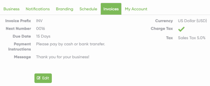 Your branding and company information, such as your logo and email, as set under the Business and Branding Settings, will also be used on your invoices and in your invoice emails.