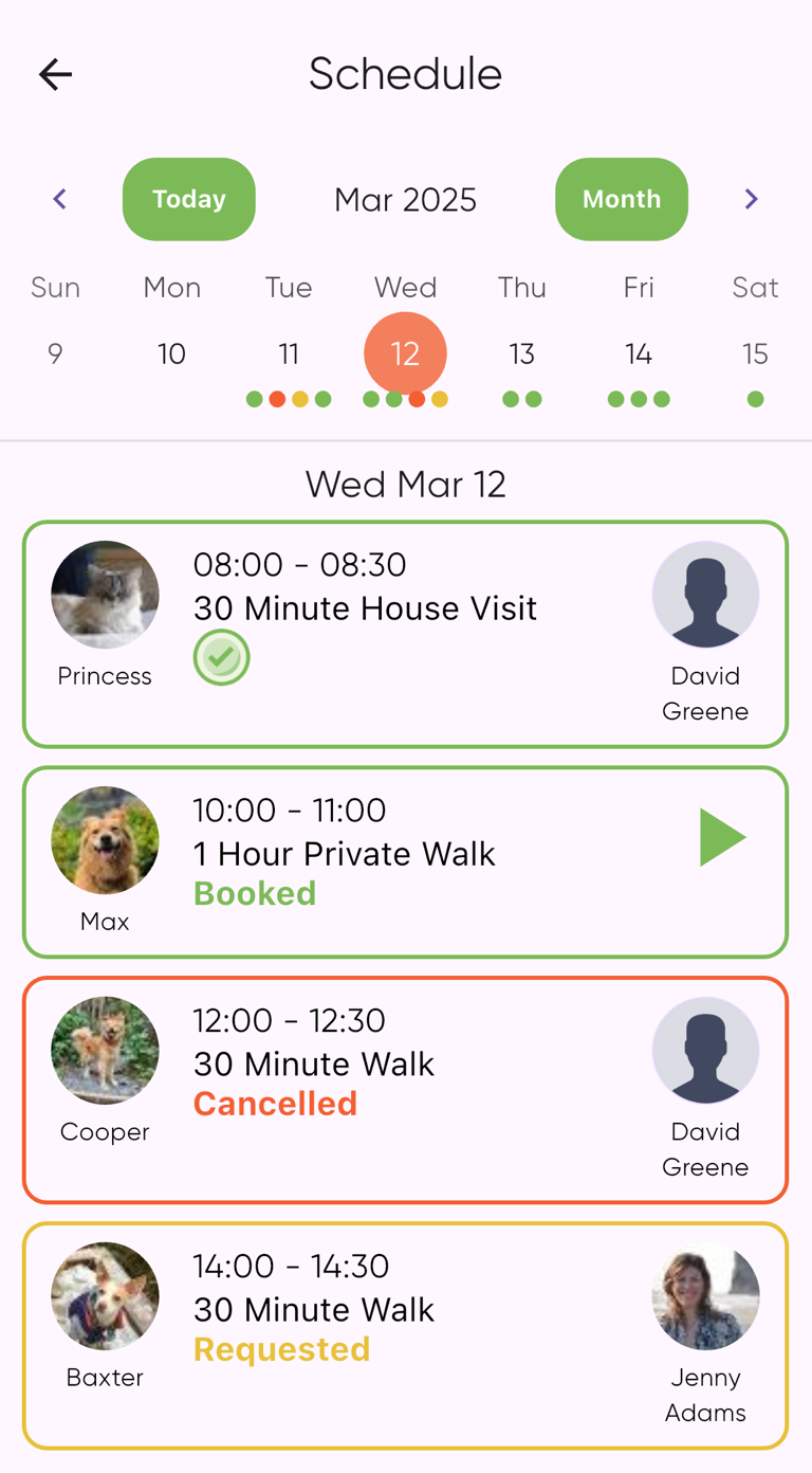 If your business uses Scheduling, go to Settings then select Schedule to see any appointments that have been booked through the Doggy Logs website. If the appointment is scheduled for today and you are the assigned Pet Sitter, you can start the service from the calendar by pressing the play button.